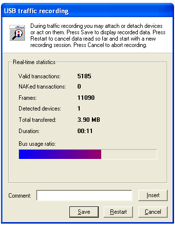 This example shows traffic recording for two peripherals, for a period of approximately one minute. The acquisition period is only limited by the computer's available memory.